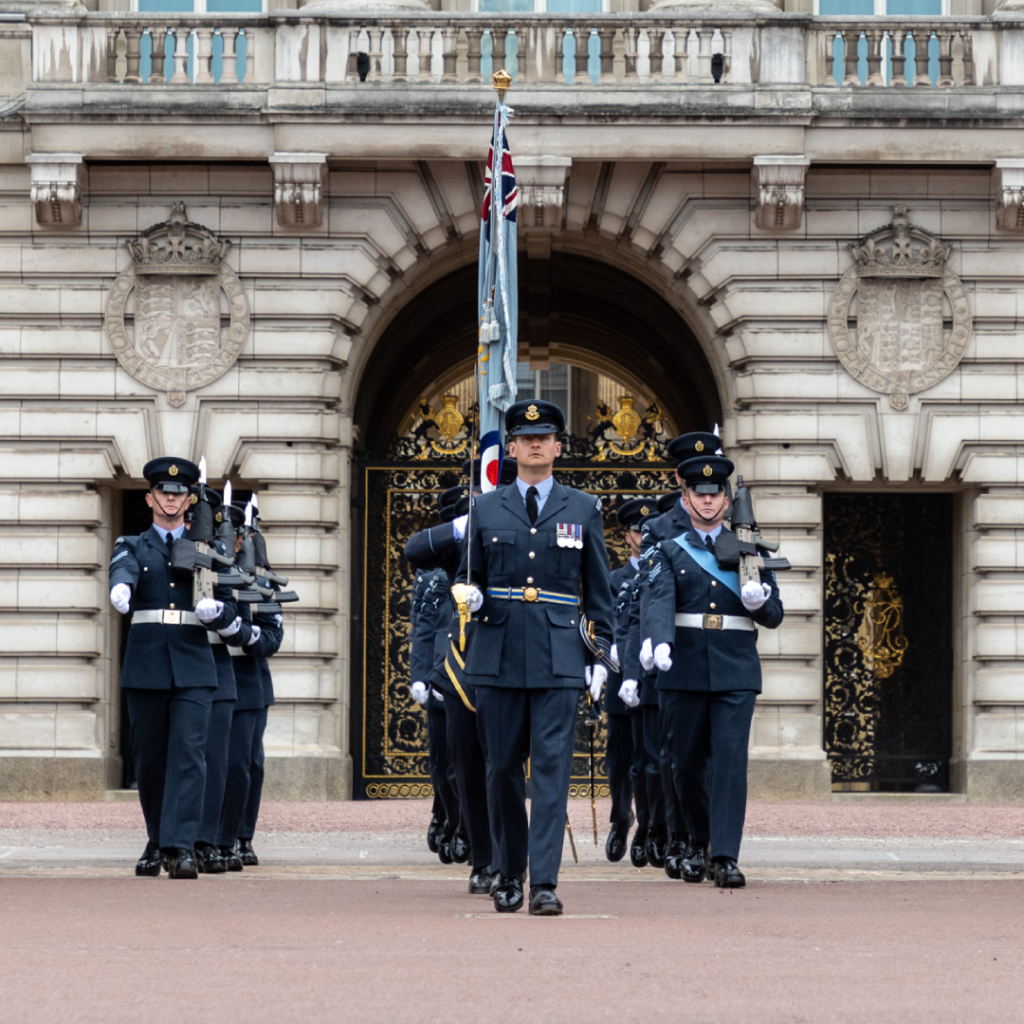 The King’s Colour Squadron is the RAF’s only dedicated ceremonial unit, and has the privilege to be the custodians of the King’s Colour for the Royal Air Force. The Squadron is responsible for representing the Royal Air Force at high profile events on both state and national ceremonial occasions including the repatriation of the late Queen Elizabeth II, the Coronation of King Charles III as well as mounting Guard at the London Palaces.