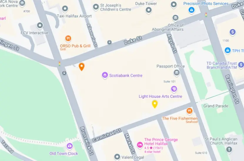 - Please arrive at the Scotiabank Centre entrance on the corner of Duke Street and Brunswick Street (Gate B) to meet your tour guide. See the Google Map at the bottom of the page.